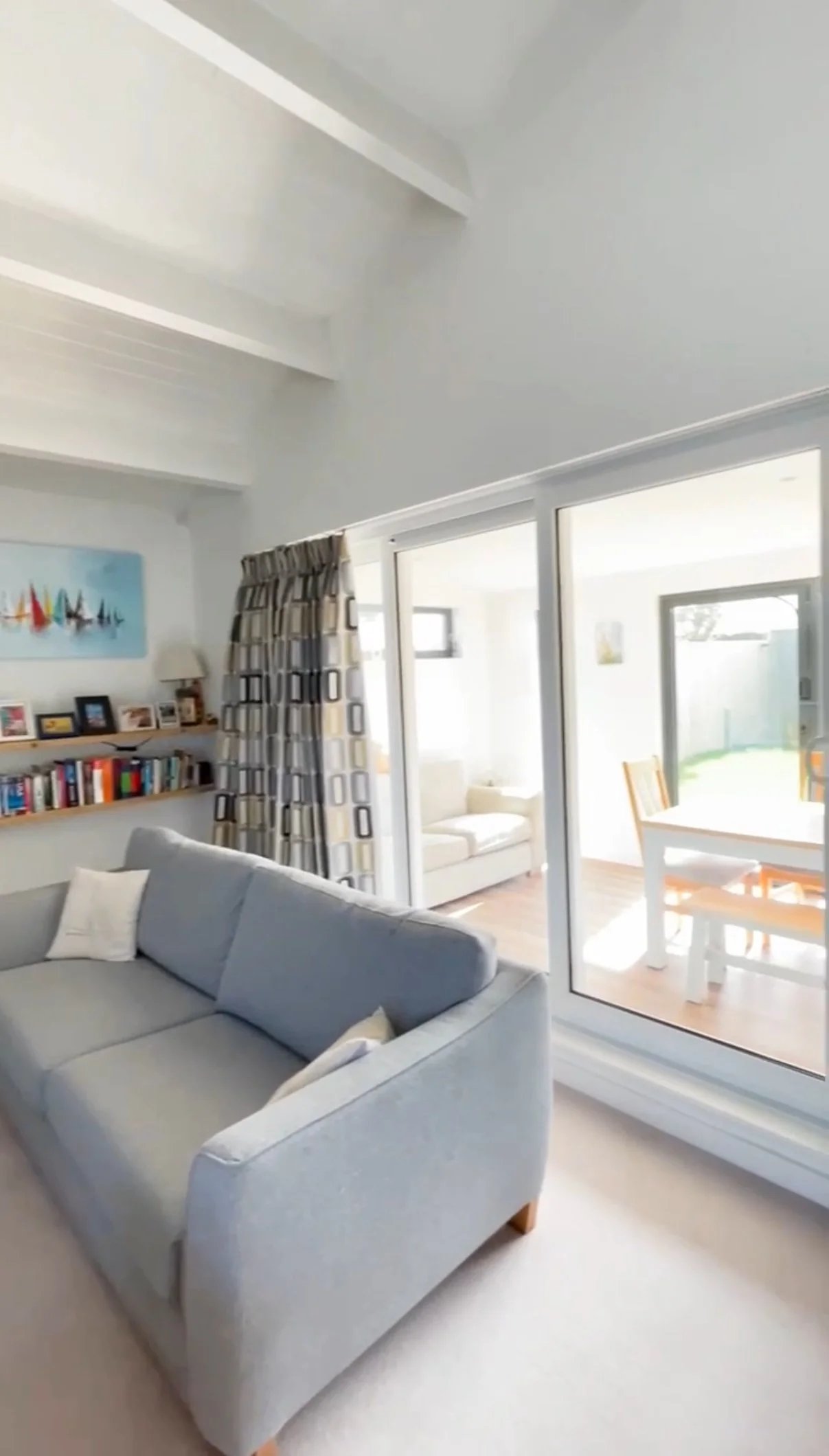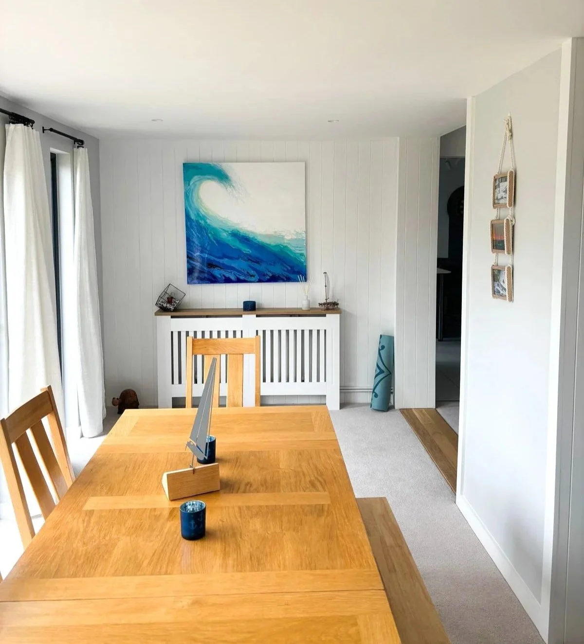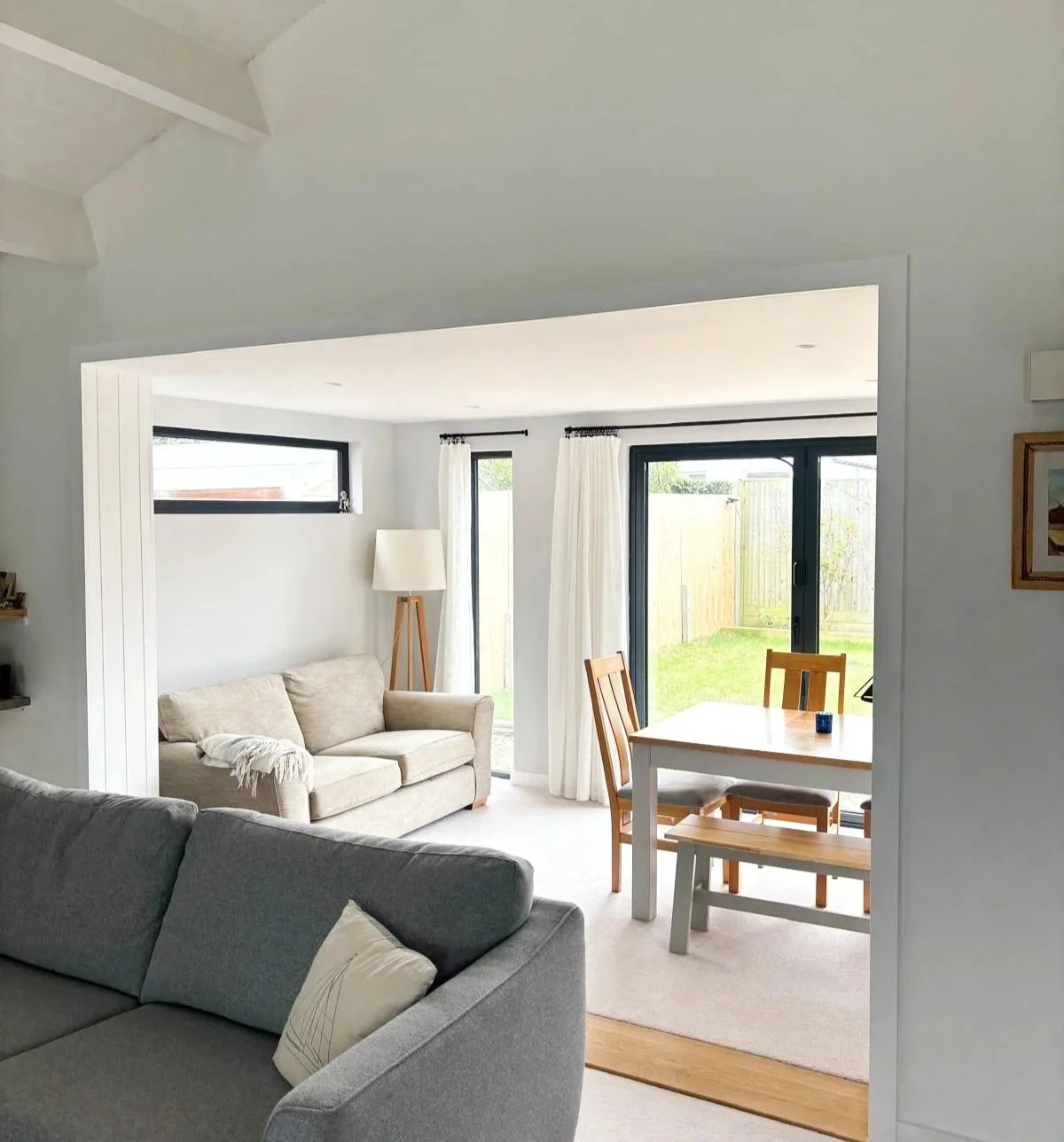 This modern home in Shoreham Beach has high ceilings and fabulous nautical features. Our clients were a young couple who had bought the house but didn’t get on well with the flow of the space. A dining extension had been added but kept separate from the house by patio doors that were cumbersome and raised off floor level, keeping the dining space cold and detached. Heavy curtains had been added to keep out the cold from the living space so in Winter the space felt so much smaller than it needed to.